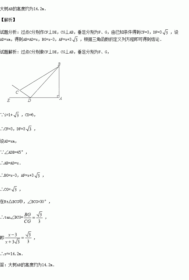 如图所示,某学校教学活动小组欲测量一颗大树AB的高度,他们在斜坡上C处测得大树顶端B的仰角是30°,朝大树方向沿斜坡向下走6m到达坡脚D处,在D处测得大树顶端B的仰角是45°,若斜坡CD的坡比i=1: