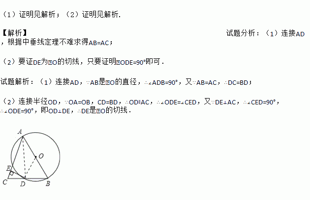 已知:AB是⊙O的直径,BD是⊙O的弦,延长BD到点C,使AB=AC,连结AC,过点D作DE⊥AC,垂足为E.