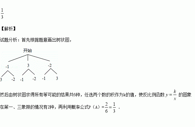 在﹣1、3、﹣2这三个数中,任选两个数的积作为k的值,使反比例函数的图象在第一、三象限的概率是 .