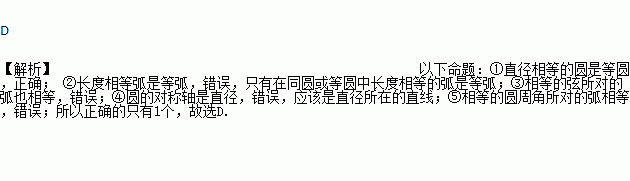 以下命题:①直径相等的圆是等圆; ②长度相等弧是等弧; ③相等的弦所对的弧也相等; ④圆的对称轴是直径;⑤相等的圆周角所对的弧相等;其中正确的个数是( )