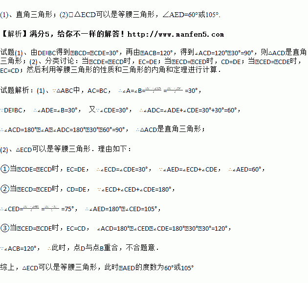 (2)在点D的运动过程中,△ECD的形状可以是等腰三角形吗?若可以,请求出∠AED的度数;若不可以,请说明理由.