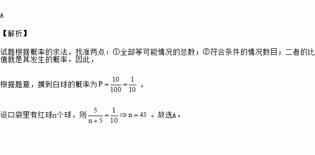 一个不透明的口袋里装有除颜色都相同的5个白球和若干个红球,在不允许将球倒出来数的前提下,小亮为了估计其中的红球数,采用如下方法,先将口袋中的球摇匀,再从口袋里随机摸出一球,记下颜色,然后把它放回口袋中,不断重复上述过程,小亮共摸了100次,其中有10次摸到白球,因此小亮估计口袋中的红球大约有个