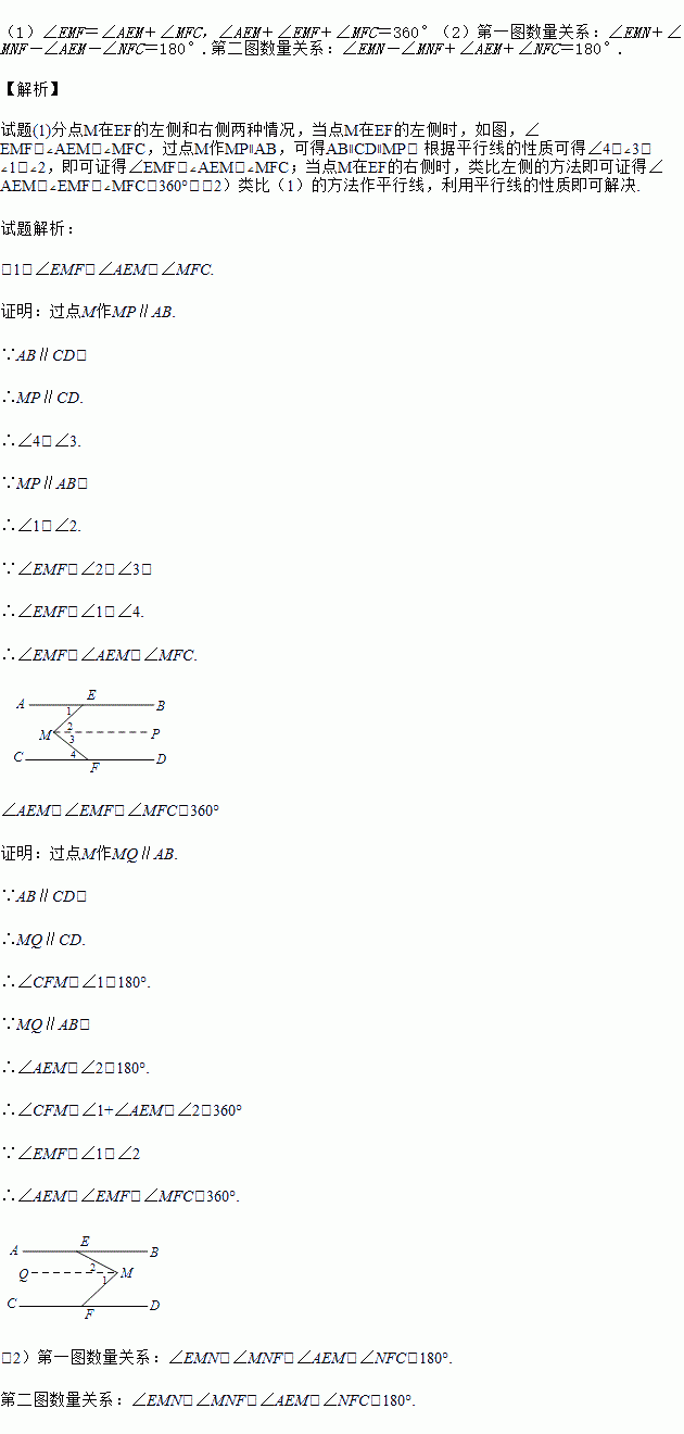 (2)如图2,在AB,CD之间有两点M,N,连接ME,MN,NF,请选择一个图形写出∠AEM,∠EMN,∠MNF,∠NFC 存在的数量关系(不需证明).