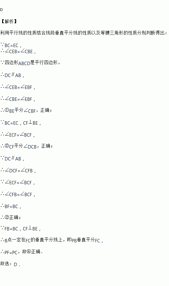 如图,四边形ABCD是平行四边形,点E是边CD上一点,且BC=EC,CF⊥BE交AB于点F,P是EB延长线上一点,下列结论:①BE平分∠CBF;②CF平分∠DCB;③BC=FB;④PF=PC.其中正确结论的个数为( )