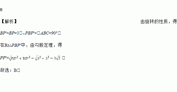 如图,点P是正方形ABCD内一点,将△ABP绕着B沿顺时针方向旋转到与△CBP′重合,若PB=3,则PP′的长为( )