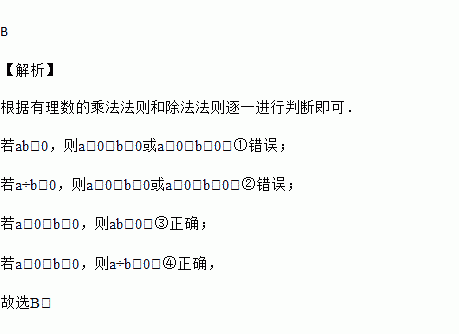 下列结论:①若ab>0,则a>0,b>0;②若a÷b<0,则a>0,b<0;③若a>0,b>0,则ab>0;④若a<0,b<0,则a÷b>0,其中,正确的个数是( )