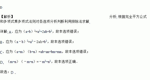 C. (a+m)(b+n)=ab+mn D. (m+n)(﹣m+n)=﹣m2+n2