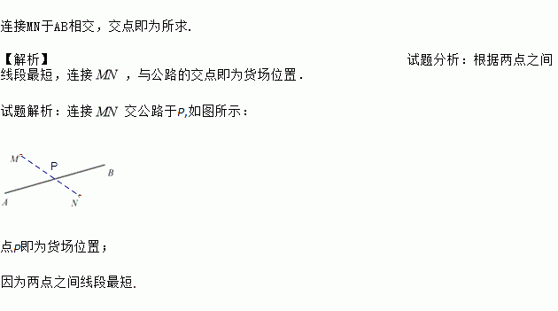 如图,直线AB表示一条公路,公路两旁各有一点M、N表示工厂,要在公路旁建一个货场,使它到两个工厂的距离之和最小,问这个货场应建在什么地方.