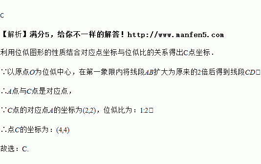 如图,线段AB两个端点的坐标分别为A(2,2)、B(3,1),以原点O为位似中心,在第一象限内将线段AB扩大为原来的2倍后得到线段CD,则端点C的坐标分别为( )