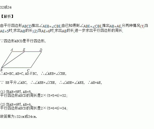 平行四边形ABCD中,∠ABC的角平分线BE将边AD分成长度为5cm和6cm的两部分,则平行四边形ABCD的周长为_____cm.
