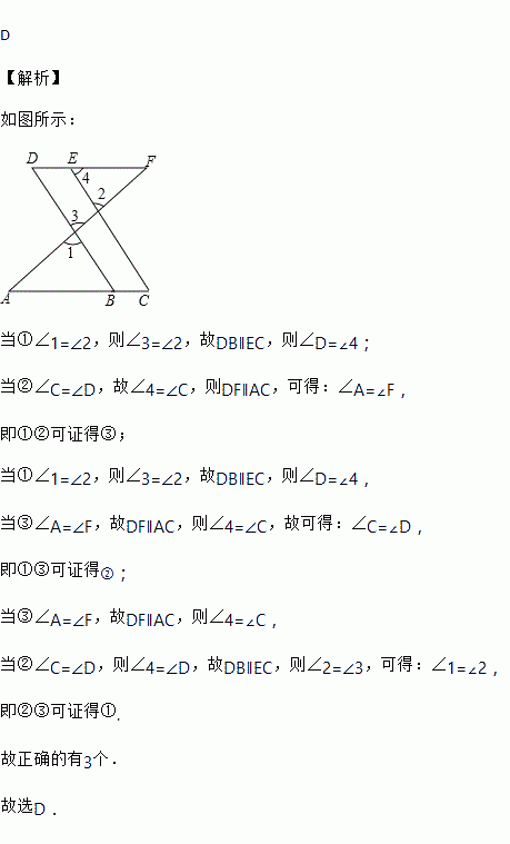 如图,从①∠1=∠2;②∠C=∠D;③∠A=∠F三个条件中选出两个作为已知条件,另一个作为结论所组成的命题中,正确命题的个数为( )