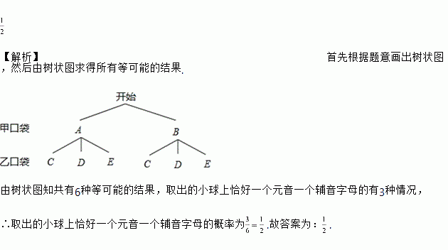 甲口袋装有2个相同的小球,它们分别写有字母A和B;乙口袋中装有3个相同的小球,它们分别写有字母C、D和E.童威从两个口袋中各随机取出一个小球,它们恰好一个元音一个辅音字母的概率是___________(字母A和E是元音,字母B、C和D是辅音)