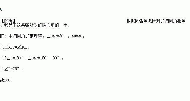 如图,△ABC内接于圆,AB=AC, 度数为60º ,则∠B的度数为( )
