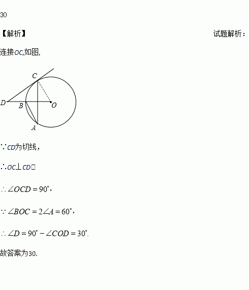 如图,AB、AC是⊙O的两条弦,∠A=30°,过点C的切线与OB的延长线交于点D,则∠D=________°.