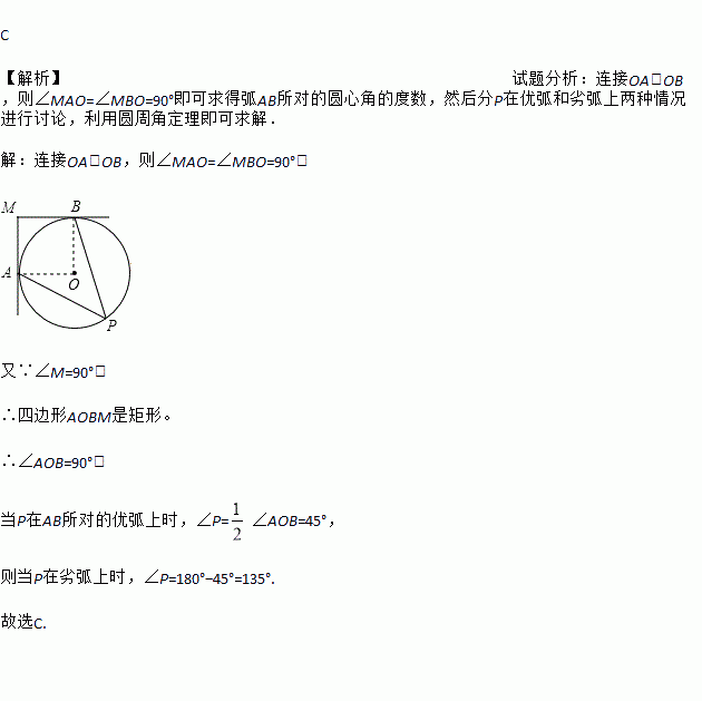 C 【解析】试题分析:连接OA、OB,则∠MAO=∠MBO=90°即可求得弧AB所对的圆心角的度数,然后分P在优弧和劣弧上两种情况进行讨论,利用圆周角定理即可求解. 【解析】 连接OA、OB,则∠MAO=∠MBO=90°, 又∵∠M=90°, ∴四边形AOBM是矩形。 ∴∠AOB=90°, 当P在AB所对的优弧上时,∠P=∠AOB=45°, 则当P在劣弧...