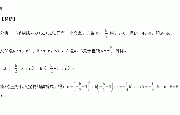 若抛物线y=x2+bx+c与x轴只有一个交点,且过点A(m,n),B(m+6,n),则n= .
