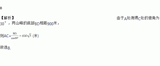 如图,风景区为了方便游人参观,计划从山峰A处架设一条缆车线路到另一山峰C处,若在A处测得C处的俯角为30°,两山峰的底部BD相距900米,则缆车线路的长为( )
