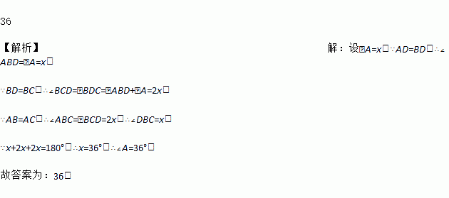 如图,在△ABC中,AB=AC,AD=BD=BC,那么∠A=__度.