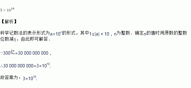 上海合作组织青岛峰会期间,为推进“一带一路”建设,中国决定在上海合作组织银行联合体框架内,设立300亿元人民币等值专项贷款.将300亿元用科学记数法表示为___________________元.