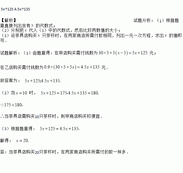 5x+125 4.5x+135 【解析】试题分析:(1)根据题意直接列出含有的代数式; (2)分别把代入(1)中的代数式,然后比较两数值的大小; (3)设茶具店购买只茶杯时,在两家商店所需付款相同,列出一元一次方程,求出的值即可. 试题解析:(1)由题意得:在甲店购买需付钱数为元; 在乙店购买需付钱数为元. 故答案为: (2)当时, ∴当茶具店需购买10只茶...