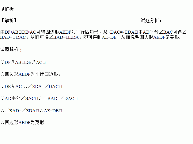 如图,在△ABC中,AD平分∠BAC,DE//AC交AB于点E,DF//AB交AC于点F.求证:四边形AEDF是菱形.