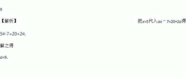 已知x=5是方程ax﹣7=20+2a的解,则a=_____________