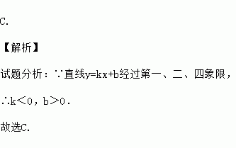 C. 【解析】 试题分析:∵直线y=kx+b经过第一、二、四象限, ∴k<0,b>0. 故选C.