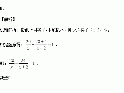 小明上月在某文具店正好用20元钱买了几本笔记本,本月再去买时,恰遇此文具店搞优惠酬宾活动,同样的笔记本,每本比上月便宜1元,结果小明只比上次多用了4元钱,却比上次多买了2本.若设他上月买了x本笔记本,则根据题意可列方程( )