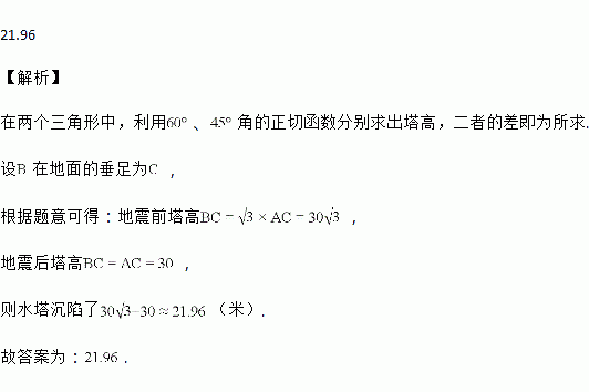 “5•12”汶川大地震使不少建筑物受损.某地一水塔地震时发生了严重沉陷(未倾斜).如图,已知地震前,在距该水塔30米的A处测得塔顶B的仰角为60°;地震后,在A处测得塔顶B的仰角为45°,则该水塔沉陷了_____米.(精确到0.01,