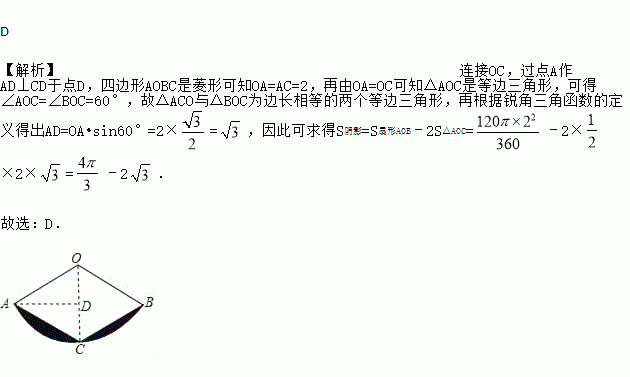 如图,扇形AOB中,OA=2,C为弧AB上的一点,连接AC,BC,如果四边形AOBC为菱形,则图中阴影部分的面积为( )
