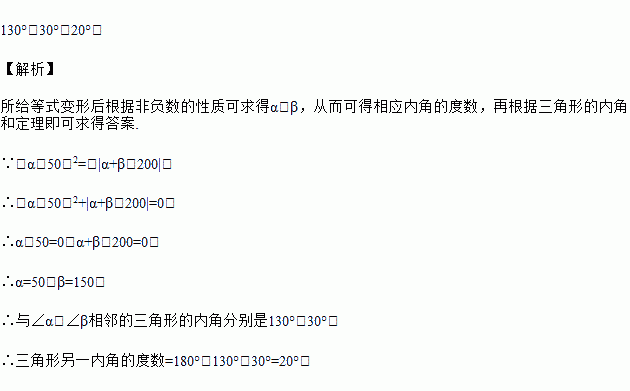 已知:三角形的两个外角分别是α°,β°,且满足(α﹣50)2=﹣|α+β﹣200|.求此三角形各角的度数.