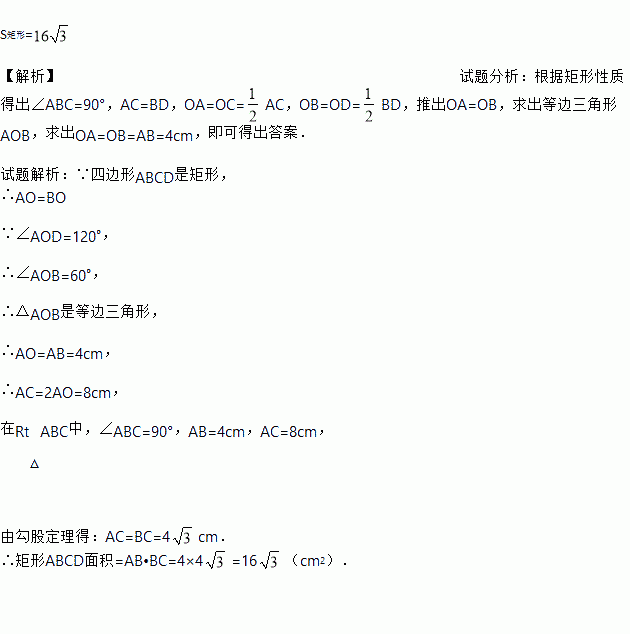 如图,矩形ABCD的两条对角线相交于O,∠AOD=120°,AB=4cm.求矩形的面积.