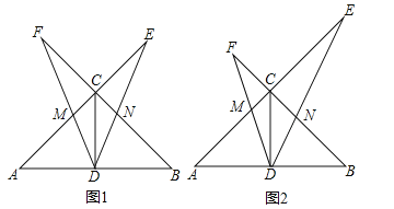 如图,在△ABC中,∠ACB=90°,CD是中线,AC=BC,一个以点D为顶点的45°角绕点D旋转,使角的两边分别与AC、BC的延长线相交,交点分别为点E,F,DF与AC交于点M,DE与BC交于点N.