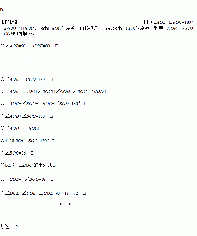如图,将两块三角尺AOB与COD的直角顶点O重合在一起,若∠AOD=4∠BOC,OE为∠BOC的平分线,则∠DOE的度数为( )