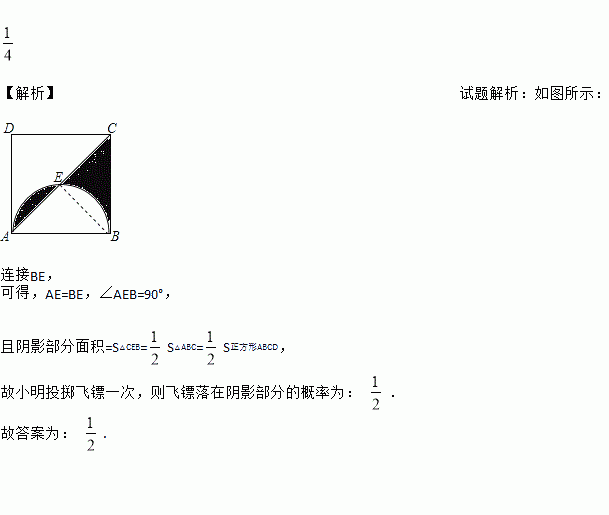 小明向如图所示的正方形ABCD区域内投掷飞镖,点E是以AB为直径的半圆与对角线AC的交点.如果小明投掷飞镖一次,则飞镖落在阴影部分的概率为____________.