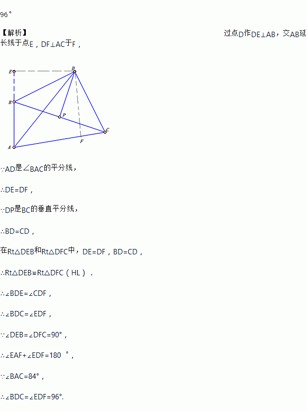 如图,△ABC中,BC的垂直平分线DP与∠BAC的角平分线相交于点D,垂足为点P,若∠BAC=84°,则∠BDC=_____.