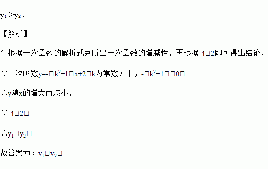 已知点(﹣4,y1),(2,y2)都在直线y=﹣(k2+1)x+2上,则y1,y2的大小关系是_____.