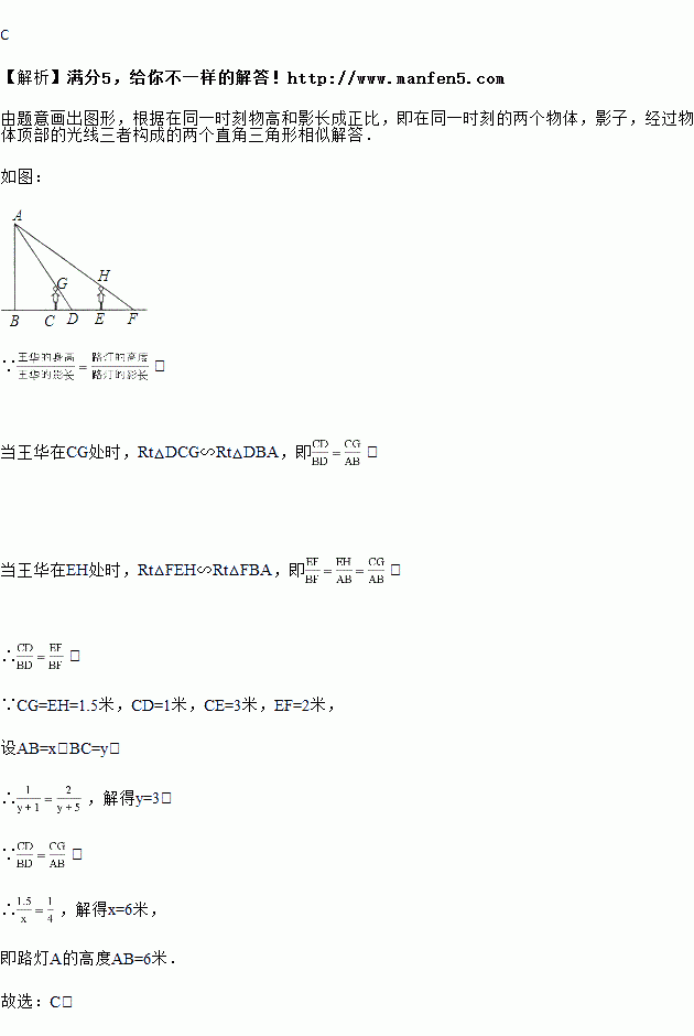 王华晚上由路灯下的处走到处时,测得影子的长为,继续往前走到达处时,测得影子的长为,他的身高是,那么路灯的高度( )