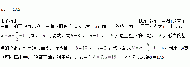 ,孔明只记得公式中的S表示多边形的面积,a和b中有一个表示多边形边上(含顶点)的整点个数,另一个表示多边形内部的整点个数,但不记得究竟是a还是b表示多边形内部的整点个数,请你选择一些特殊的多边形(如图1)进行验证,得到公式中表示多边形内部的整点个数的字母是______,并运用这个公式求得图2中多边形的面积是____________.