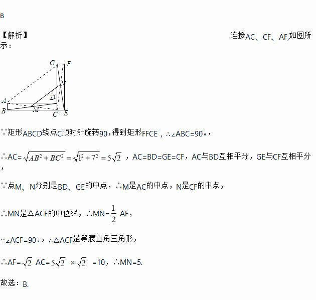 如图,将矩形ABCD绕点C顺时针旋转90°得到矩形FGCE,点M、N分别是BD、GE的中点,若BC=7,CE=1,则MN的长( )