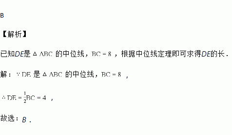 如图,DE是△ABC的中位线,若BC=8,则DE的长为( )