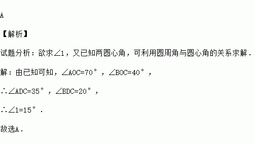 如图,量角器外沿上有A、B两点,它们的读数分别是70°和40°,则∠1的度数( )