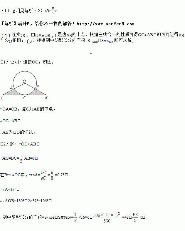 如图,在△AOB中,OA=OB,点C为AB的中点,AB=16,以点O为圈心,6为半径的圆经过点C,分别交OA、OB于点E、F.