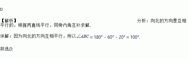 如图,小轩从A处出发沿北偏东60°方向行走至B处,又沿北偏西20°方向行走至C处,则∠ABC的度数是( )