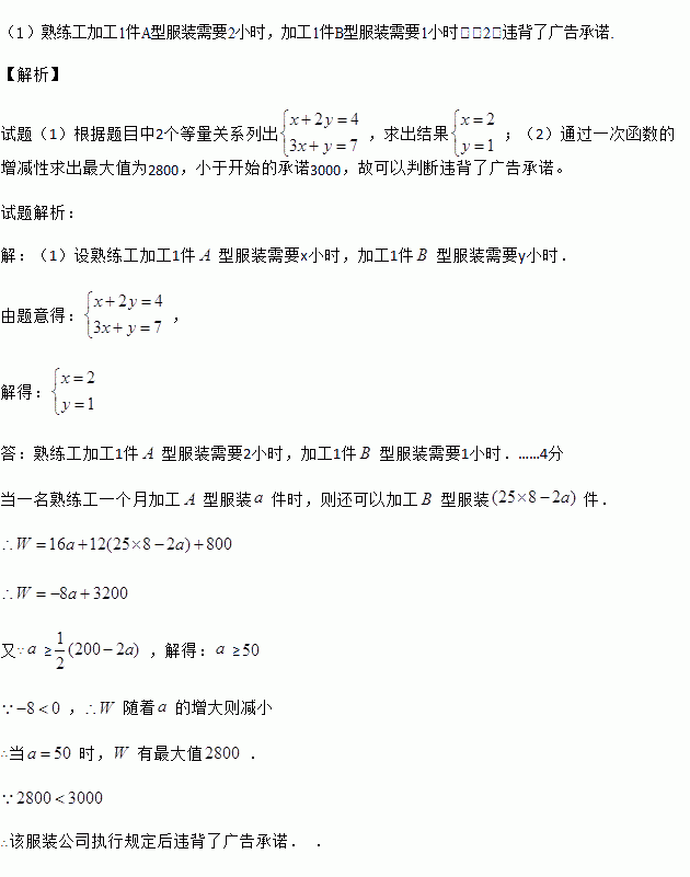 (某服装公司招工广告承诺:熟练工人每月工资至少3000元。每天工作8小时,一个月工作25天。月工资底薪800元,另加计件工资。加工1件A型服装计酬16元,加工1件B型服装计酬12元。在工作中发现一名熟练工加工1件A型服装和2件B型服装需4小时,加工3件A型服装和1件B型服装需7小时.(工人月工资底薪+计件工资)