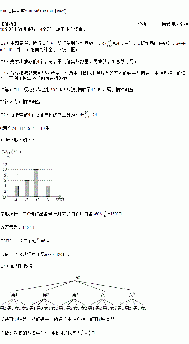 济南某中学在参加“创文明城,点赞泉城”书画比赛中,杨老师从全校30个班中随机抽取了4个班(用A,B,C,D表示),对征集到的作鼎的数量进行了分析统计,制作了两幅不完整的统计图.
