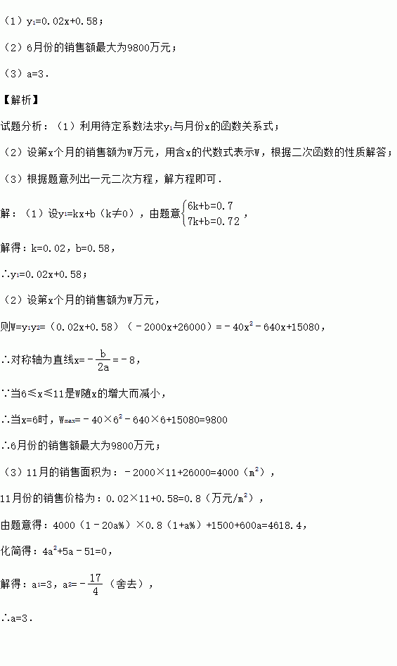 (1)y1=0.02x+0.58; (2)6月份的销售额最大为9800万元; (3)a=3. 【解析】 试题分析:(1)利用待定系数法求y1与月份x的函数关系式; (2)设第x个月的销售额为W万元,用含x的代数式表示W,根据二次函数的性质解答; (3)根据题意列出一元二次方程,解方程即可. 【解析】 (1)设y1=kx+b(k≠0),由题意, 解得...