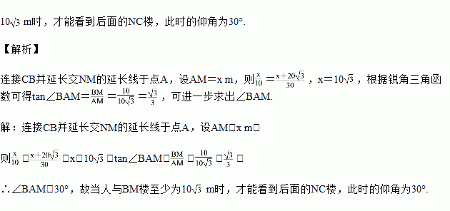 如图,两楼之间距离MN=20 m,两楼的高各为10 m和30 m,则当你至少与BM楼相距多少米时,才能看到后面的NC楼?此时,你的仰角是多少度?