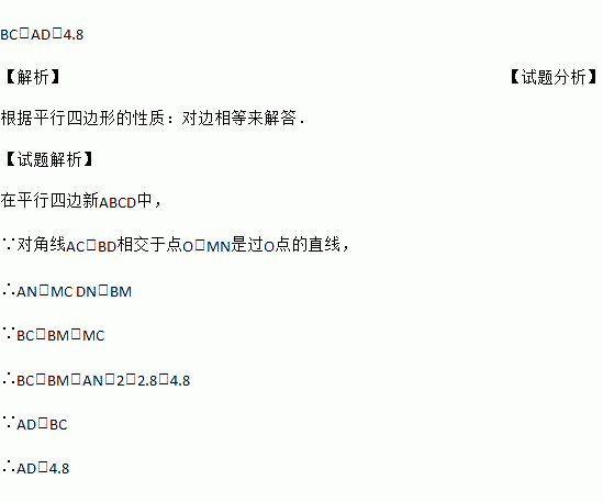 如图,在平行四边形ABCD中,对角线AC,BD相交于点O,MN是过O点的直线,交BC于M,交AD于N,BM=2,AN=2.8,求BC和AD的长.