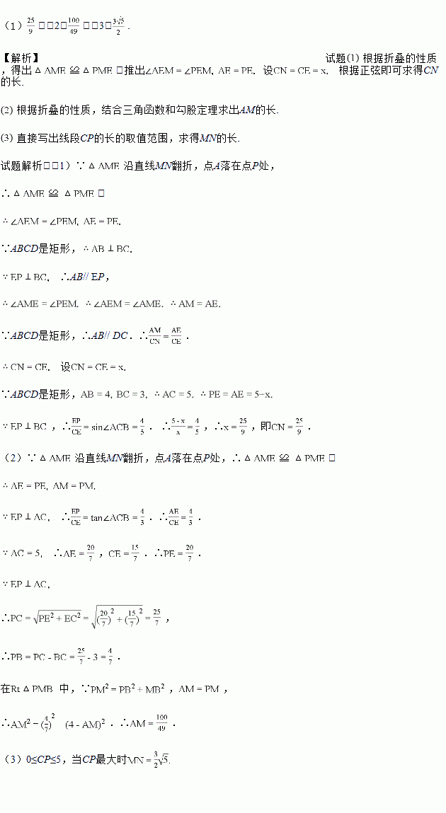 已知:矩形ABCD中,AB=4,BC=3,点M、N分别在边AB、CD上,直线MN交矩形对角线 AC于点E,将△AME沿直线MN翻折,点A落在点P处,且点P在射线CB上.